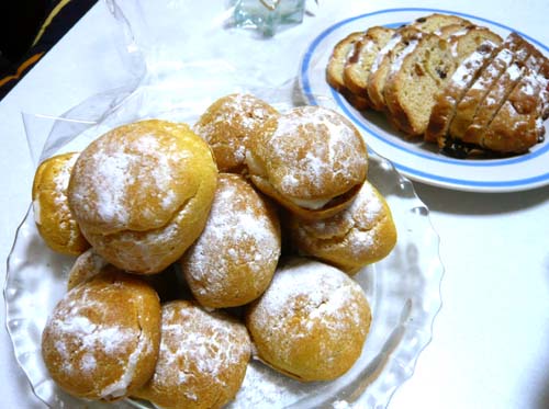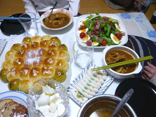 サラダとメインデッシュが私作で、マッシュポテトがけんじ作で、シュークリームとシュトーレンとちぎりパン(ぼこぼこしてる目立ってる可愛いやつ)が蕗作で、
