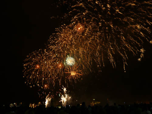 たった15分だけど、迫力満点!!!日本で見る花火とは、魅せ方が違うなあと感じました。ひとことでいうと、「ずっとスターマイン」ってかんじ。とにかく、上げろ~上げてしまえ~~~打ち上げろーーーーー!!!ってかんじで凄かったです。すべて水上から打ち上げるから、かなり近い。どっかんどっかん、すごい迫力でした。
