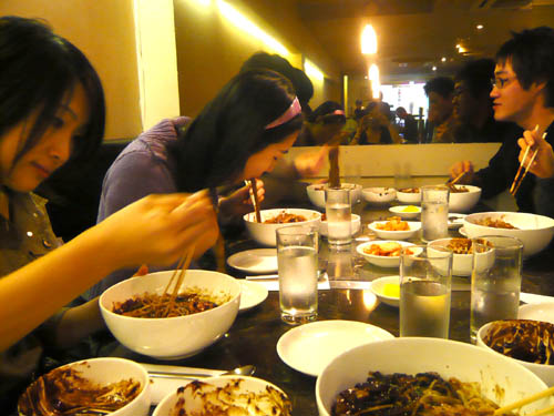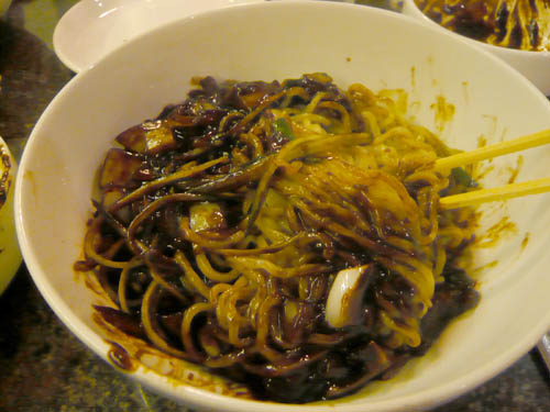 韓国料理では有名という、名前は忘れたけど黒い麺を食べた。タマネギがたくさん入った黒いソースが運ばれてきて、これは何!?みたいに思ってたら麺が運ばれてきて(大量)、どうやら混ぜて食べるらしい。