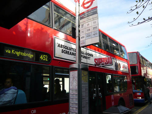 赤い二階建て!まさにロンドン!と思いきや。うちらの乗るバスだけ、何故か1階しかない普通のバスだった・・