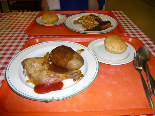 夕飯は、メインディッシュがチキン・パスタ・肉らしき物体 の3つから選べて、副菜がサラダ・茹で野菜・牛肉ソース(?)・コロッケなど。んで主食が、タイ米かじゃがいも。あとコーンスープ。