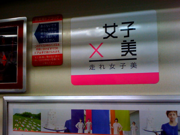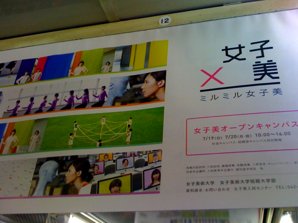 最近は不景気なのかなんなのか…中途半端な車両ジャックが多い気がしてたんだけど(中吊りだけとかドアの横だけとか)、この女子美の広告は徹底的にすべてのスペースを使ってて、同じ車両に他の広告は一切無くて、圧巻圧巻!!ここまでジャックしてくれると気持ちいい♪