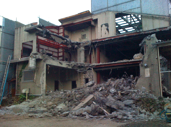 どんな廃墟だ!?とビックリ、地元「大月駅」で、さっき撮りました。昨日までヤマザキデイリーストア(コンビニ)とトヨタレンタカーがあったのに、、